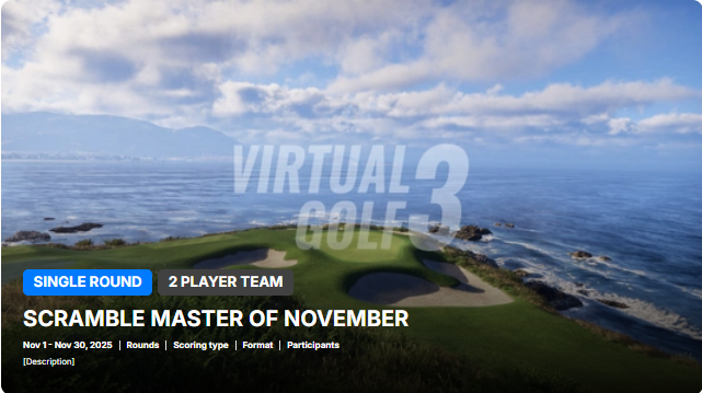 2-manna Scramble som kommer att spelas en gång per månad. Du hittar din egen spelpartner. I November spelas tävlingen på Pebble Beach Golf Links.