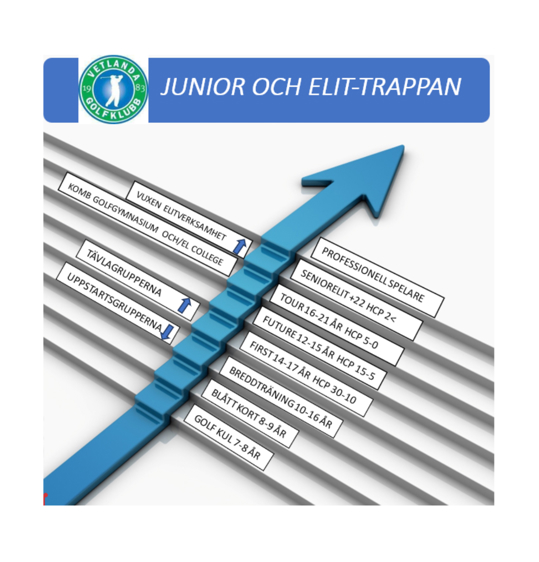Vi delar in ungdomsträningen i sex delar. Men det finns fler steg allt eftersom. Utveckling har en förmåga att aldrig stanna av. Under finns en tänkt struktur för din utveckling från knatte till proffs i ungdomsverksamheten på Vetlanda Golfklubb.